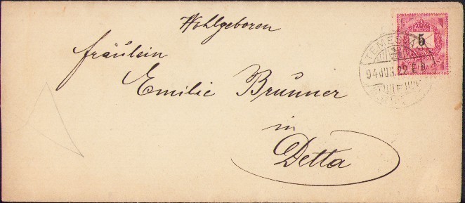 Plic cu timbru de 5 coroane Magyar kir posta circulat poștal Timișoara-Deta, 1894