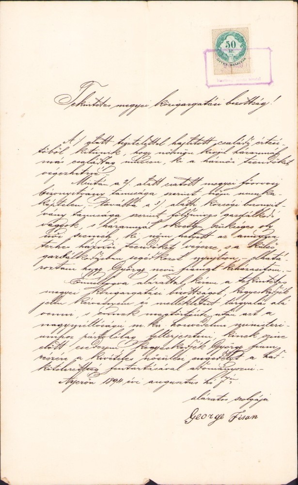 Petiție adresată fișpanului (prefectului) comitatului Torontal, Zombori Rónay Jenő (semnată olograf de el) pentru permiterea căsătoriei unui tânăr român de vârstă militară, Nerău, 1894. Limba maghiară.