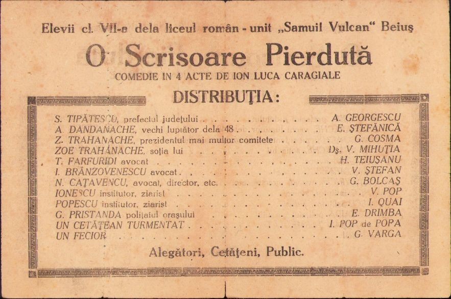 Program O scrisoare pierdută, 1945, Liceul Samuil Vulcan, Beiuș.