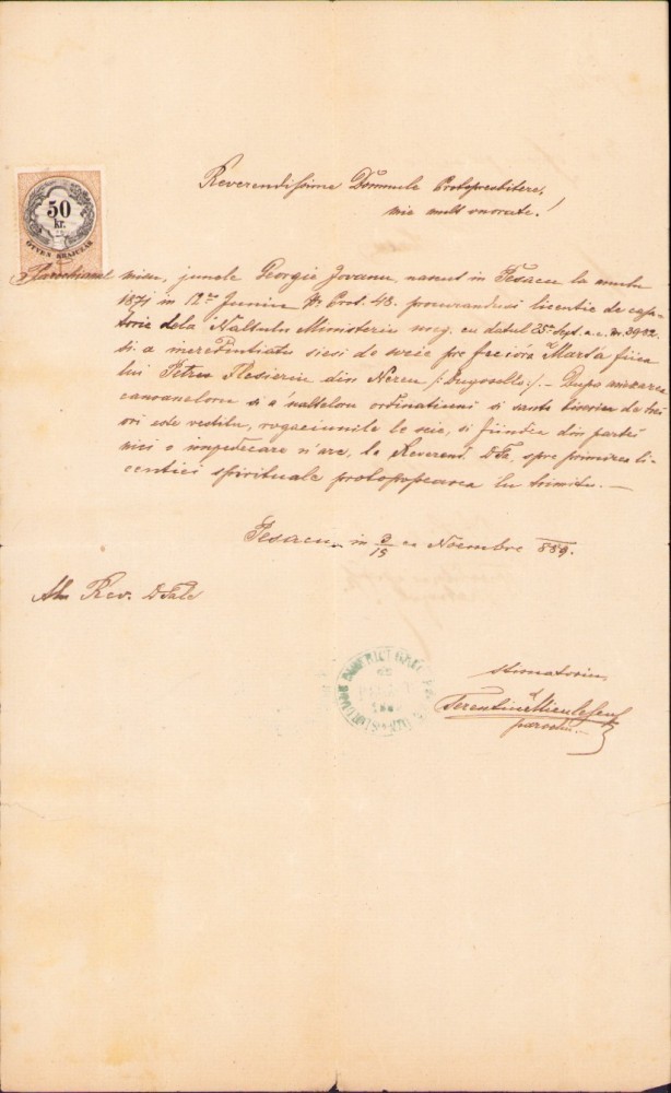 Cu ștampila model 1865 a bisericii ortodoxe din Pesac și timbru fiscal de 50 creițari.