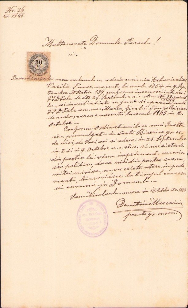 Cu ștampila bisericii ortodoxe din localitate, cu inscripție în limba sârbă, cu caractere chirilice și timbru fiscal de 50 creițari.