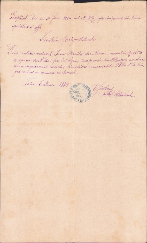 A2518N Licență protopresbiterală de căsătorie, 1884, Folea, județul Timiș