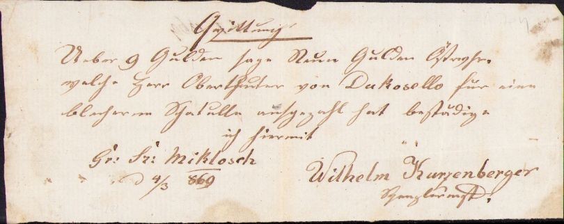 Chitanță de mână, 1869, Sânnicolau Mare, județul Timiș, Banat, în limba germană