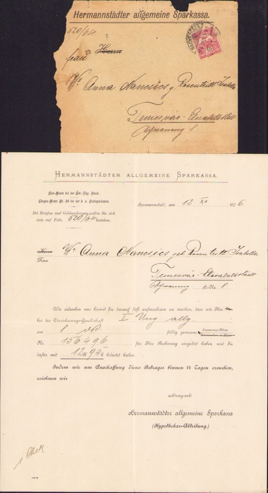 Plic și scrisoare, 1906, cu antetul Hermannstadter Allgemeine Sparkassa