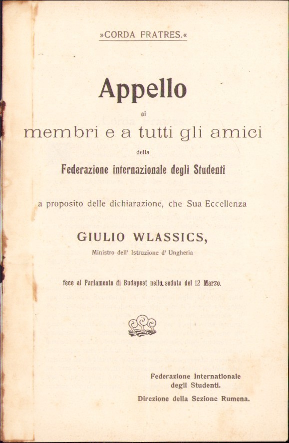 A2614N Lucian Bolcaș, vicepreședinte Corda Fratres, 1902, Appello ai membri e a tutti gli amici della Federazione ...