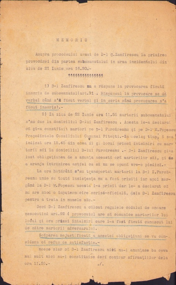 A2671N Memoriu-protest pentru nerespectarea regulilor duelului de către cel provocat, Pitești