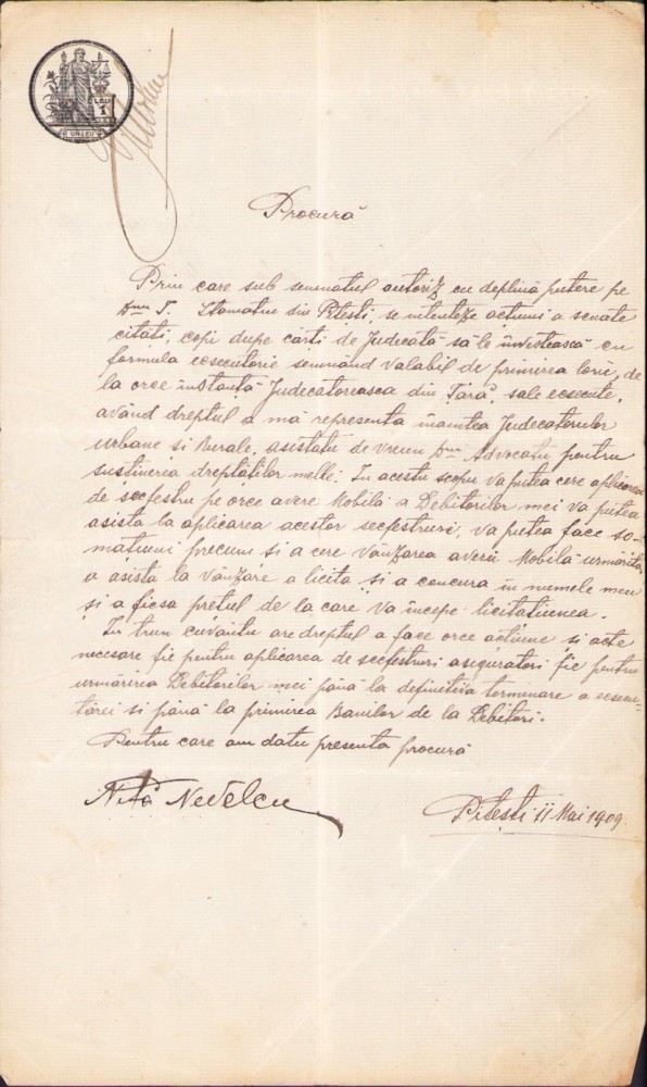 A2680N Procură pentru reprezentare în fața instanțelor judecătorești, punere sechestru și licitații, 1909, Pitești