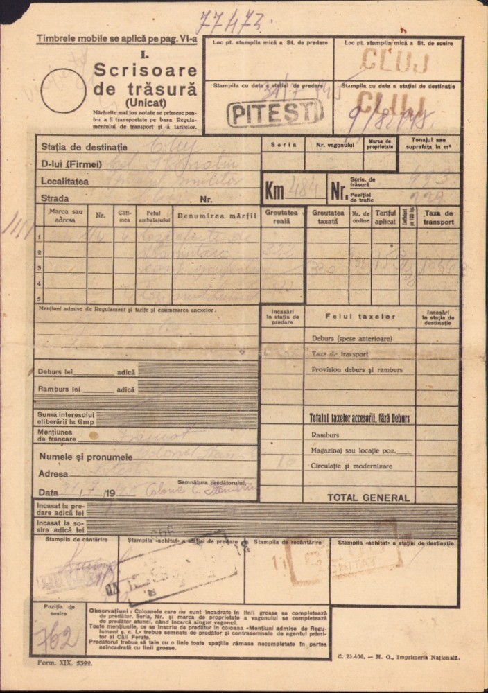 A2725N Scrisoare de trăsură, Pitești-Cluj, 1945