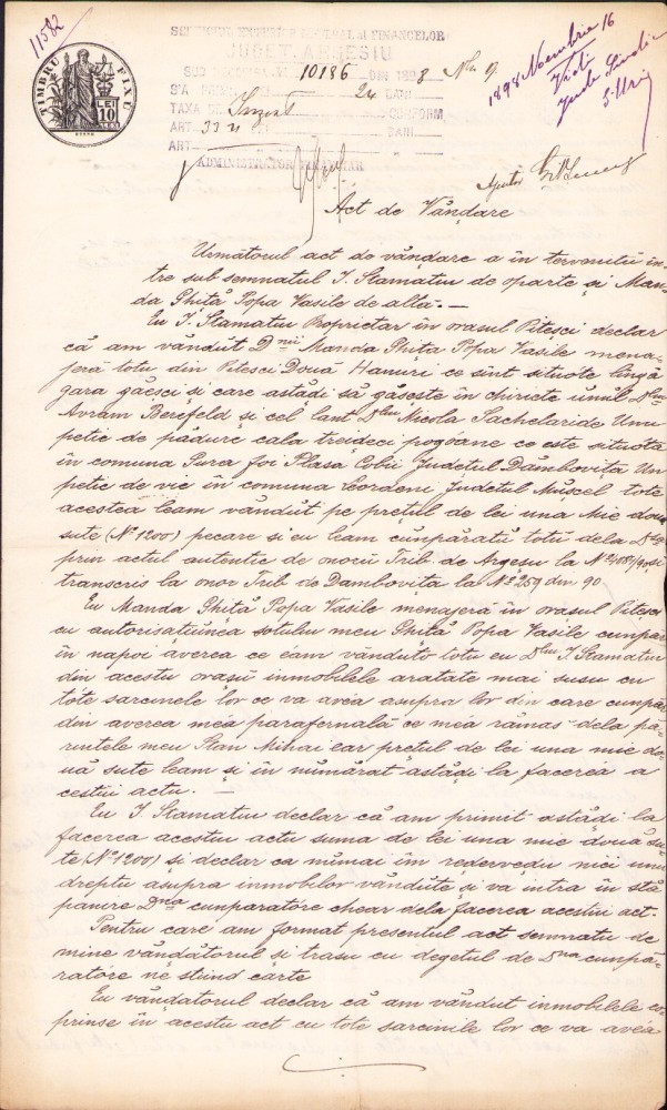 A2737N Act de cumpărare înapoi de către vânzător a unor hanuri, pădure, vie etc, 1898, Pitești, semnat de cumpărător prin punerea degetului