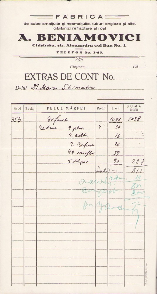 Fabrica de sobe smălțuițe și nesmălțuite, tuburi engleze și alte, cărămizi refractare și roșii A Beniaminovici, Chișinău, Basarabia, anii 1930, act cu antet