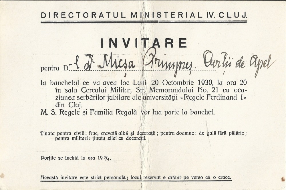 Invitație la banchetul dat cu ocazia serbărilor jubiliare a Universității Regele Ferdinand I din Cluj, 1930, adresată președintelui Curții de Apel Cluj, Pompei Micșa, cu participarea Regelui și a Familiei Regale.
