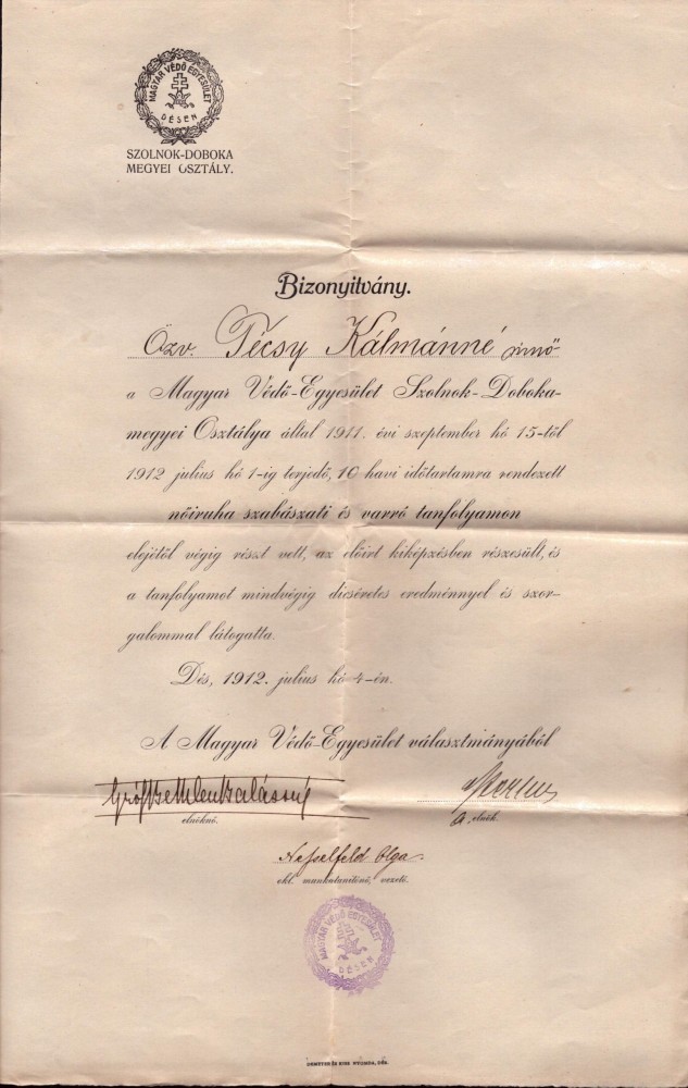 Certificat de croitoreasă pentru femei, 1912, Dej, județul Cluj.
