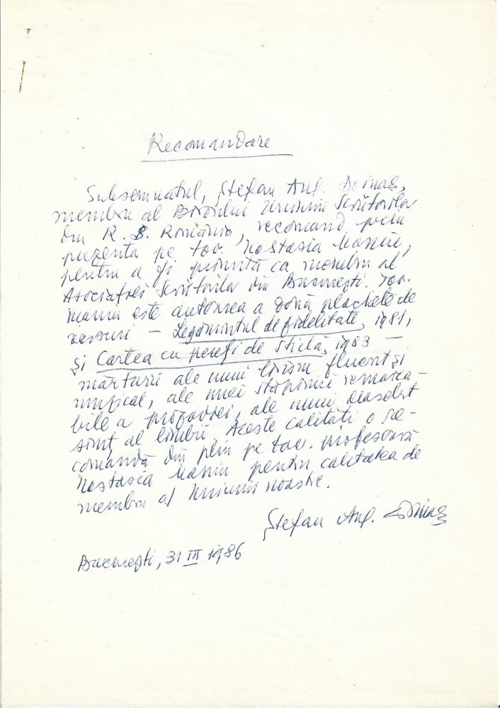 A3392N Act scris și semnat olograf de Ștefan Augustin Doinaș, 1986