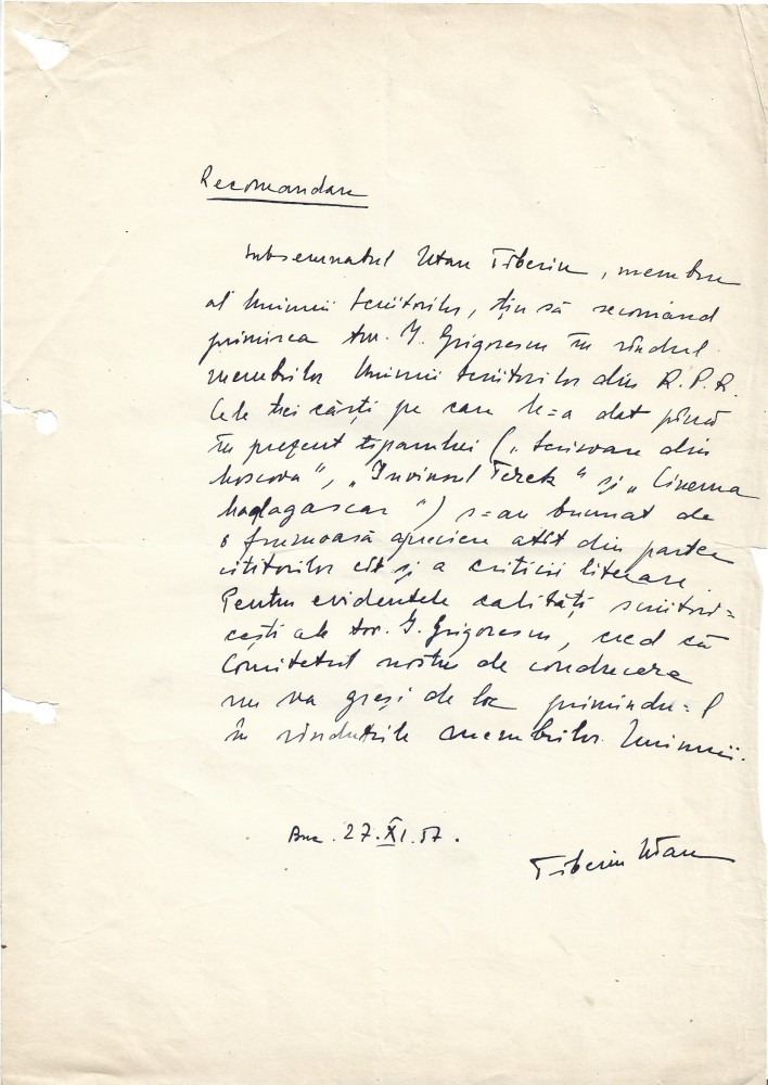 Tiberiu Utan, act scris și semnat olograf, 1957