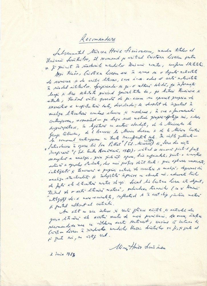 Mircea Horia Simionescu, act scris și semnat olograf, 1983
