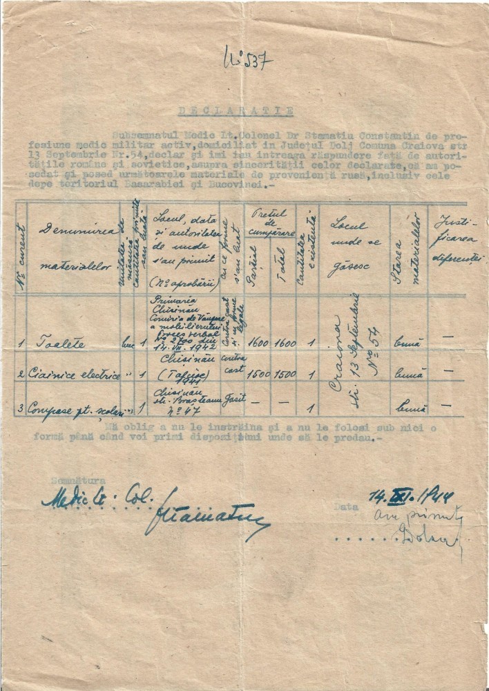 Declarație privind deținerea de bunuri de proveniență rusă obținute în timpul celui de-al Doilea Război Mondial, inclusiv de pe teritoriul Basarabiei și Bucovinei de Nord, 1944, Craiova