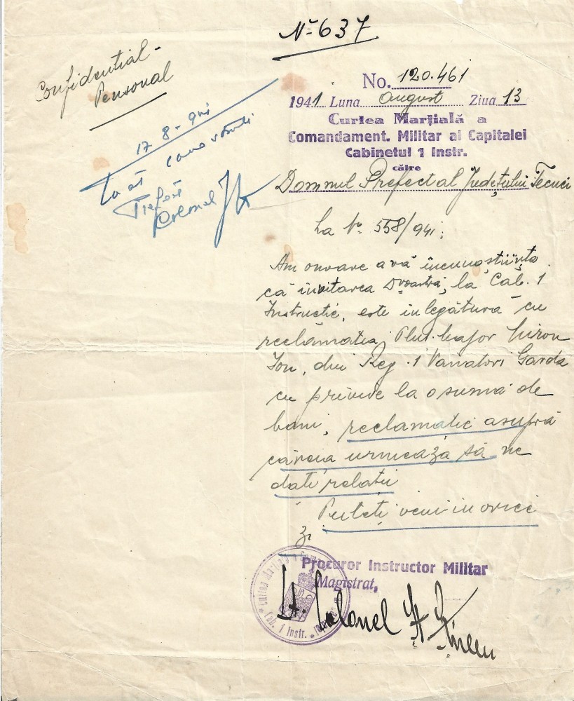 Act Curtea Marțială a Comandamentului Militar al Capitalei, Cabinetul 1 Instrucție, 1941