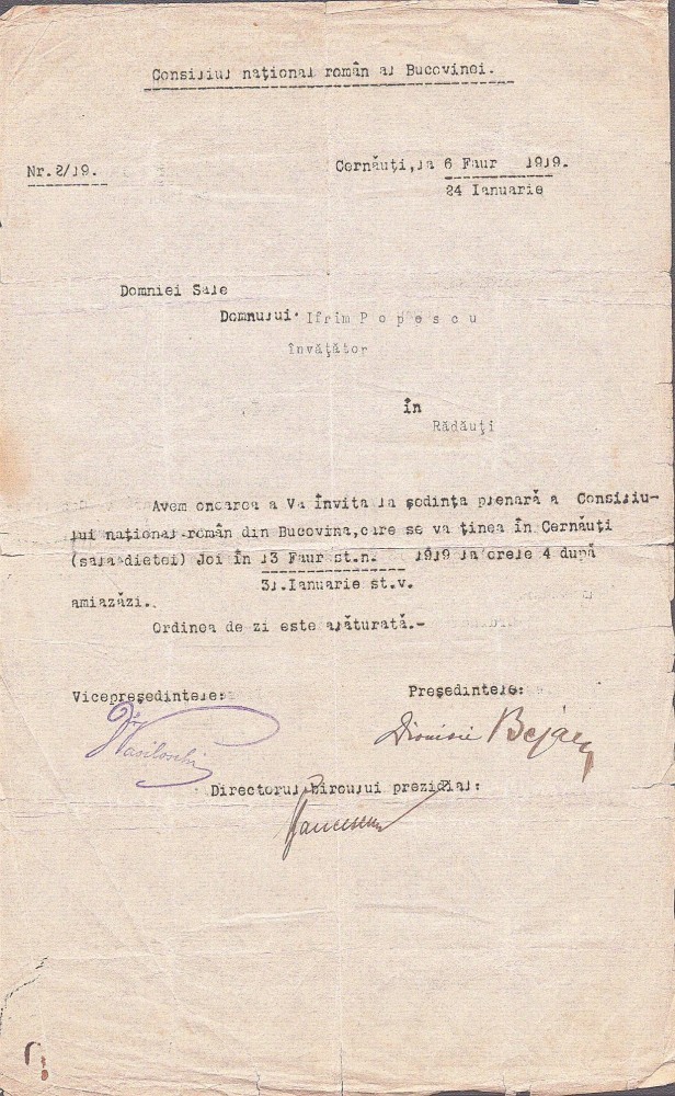 A4028N Consiliul Național Român al Bucovinei, semnătura olografă a președintelui său, Dionisie Bejan, 1919, Cernăuți