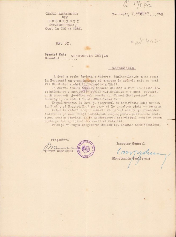A417 Document cu ștampila „Cercului Bănățenilor” din București, 1942, semnat de Petre Nemoianu, manu propria