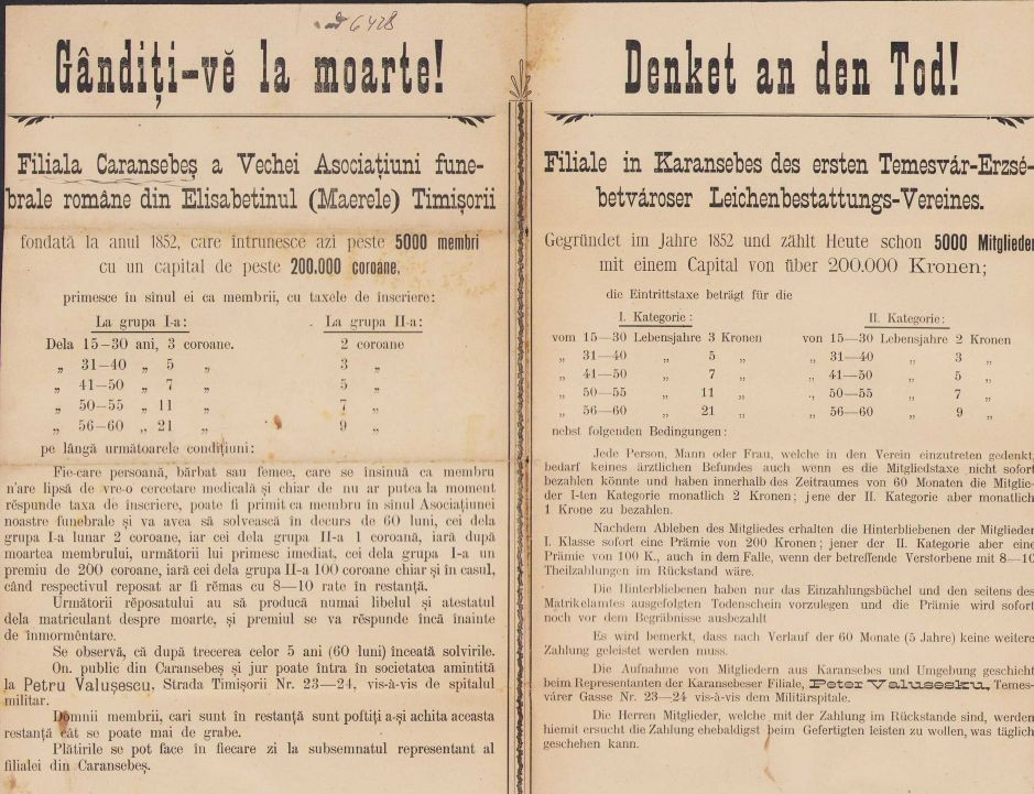 A421 Reclamă pentru înscriere în Vechea Asociațiune Funebrală Română din Timișoara, secol al XIX-lea