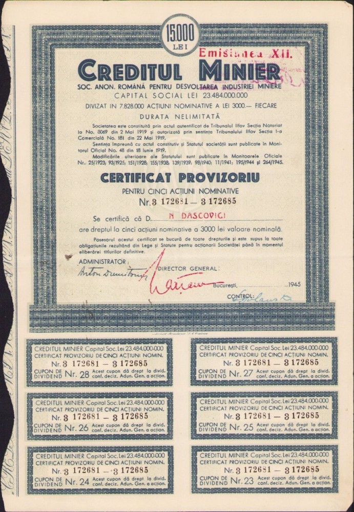 A532 Acțiune Creditul Minier pe numele academicianului Nicolae Dașcovici