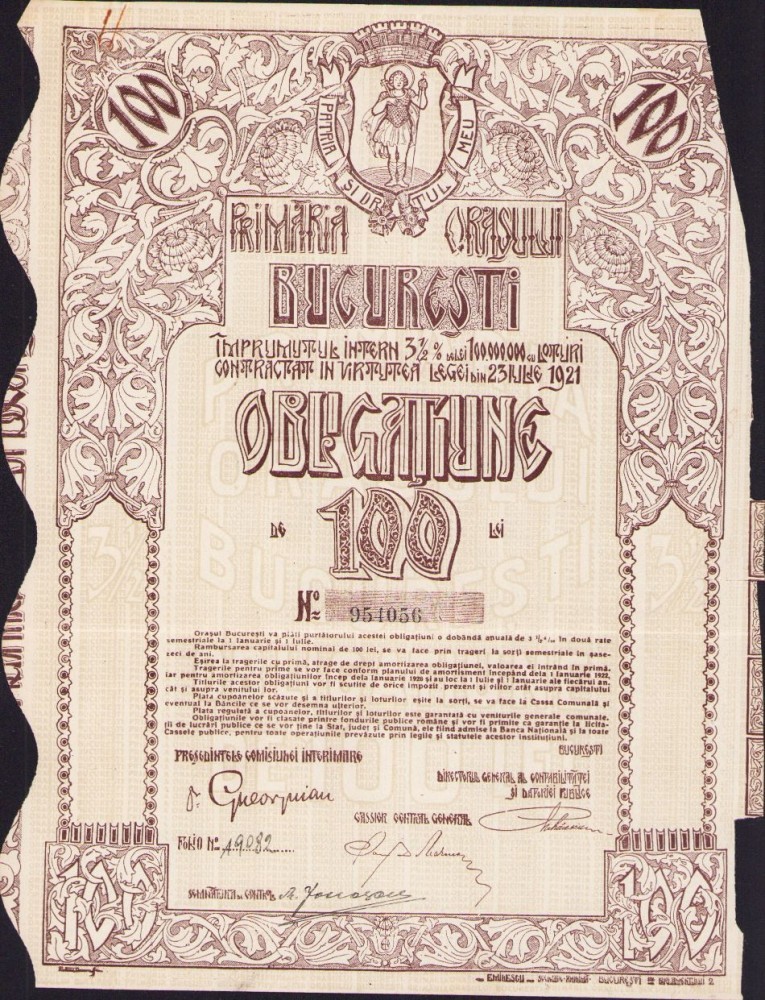 A538 Obligațiune de 100 lei Primăria orașului București, interbelică