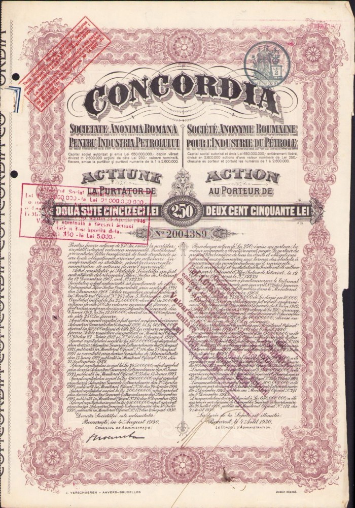 A578 Acțiune la purtător de 250 lei Concordia, interbelică