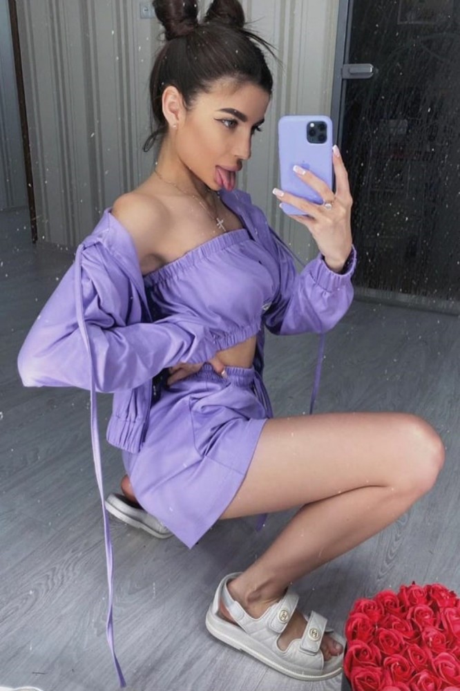 Tinuta casual de vara, cu aspect modern si sexy. Este formata din bustiera cu incretituri, bluza cu gluga si maneci lungi si pantaloni scurti cu talie inalta, pe elastic. Produs masurat si verificat - tip tinuta de vara - stil casual - aspect modern, sexy - bustiera cu incretituri - bluza cu gluga - maneci lungi - pantaloni scurti cu talie inalta - material: 70% Bumbac, 25% Poliester, 5%Lycra