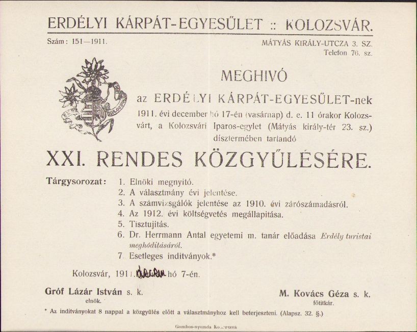 Invitație Erdélyi Kárpát Egyesület, E.K.E., meghivó, 1911, Cluj