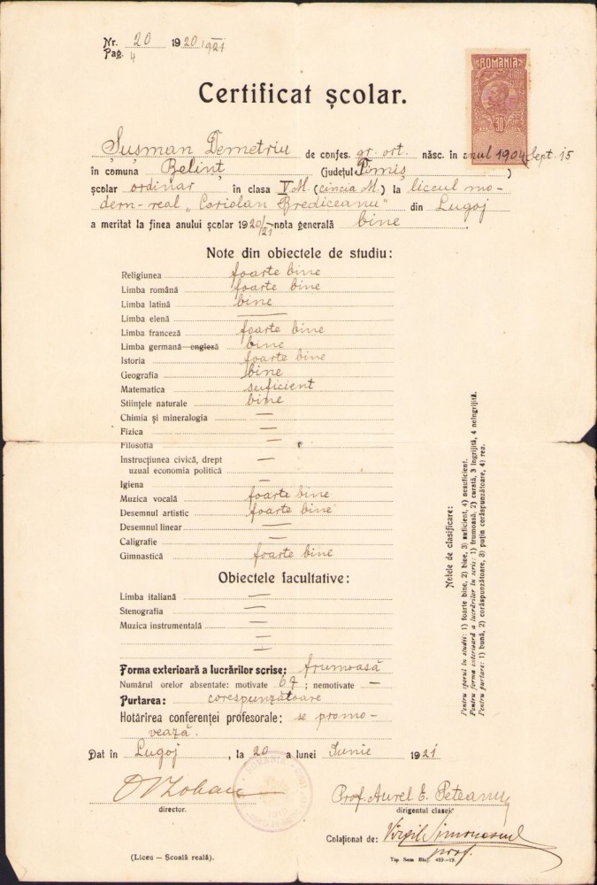 Certificat școlar Liceul Coriolan Brediceanu, 1921, Lugoj