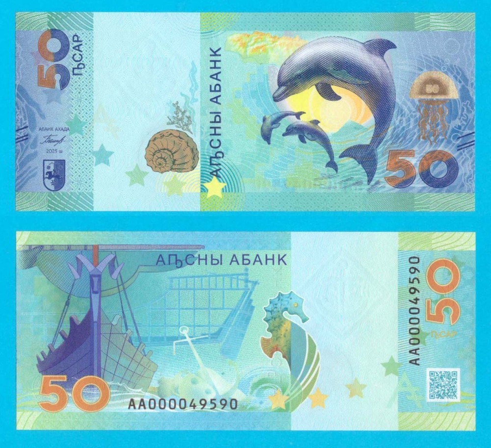 Abhazia (p#4) 50 Apsars 2025 UNC 'Delfini' serie: AA000049590 ; faţă: Stema Abhaziei; șapte stele cu 5 colțuri; scoică de mare; corali; trei delfini; meduze; verso: prova navei de război medievale abhaziene; ancoră; cal de mare; șapte stele cu cinci colțuri; cod QR; material: hârtie; dimensiuni: 150x65 mm;