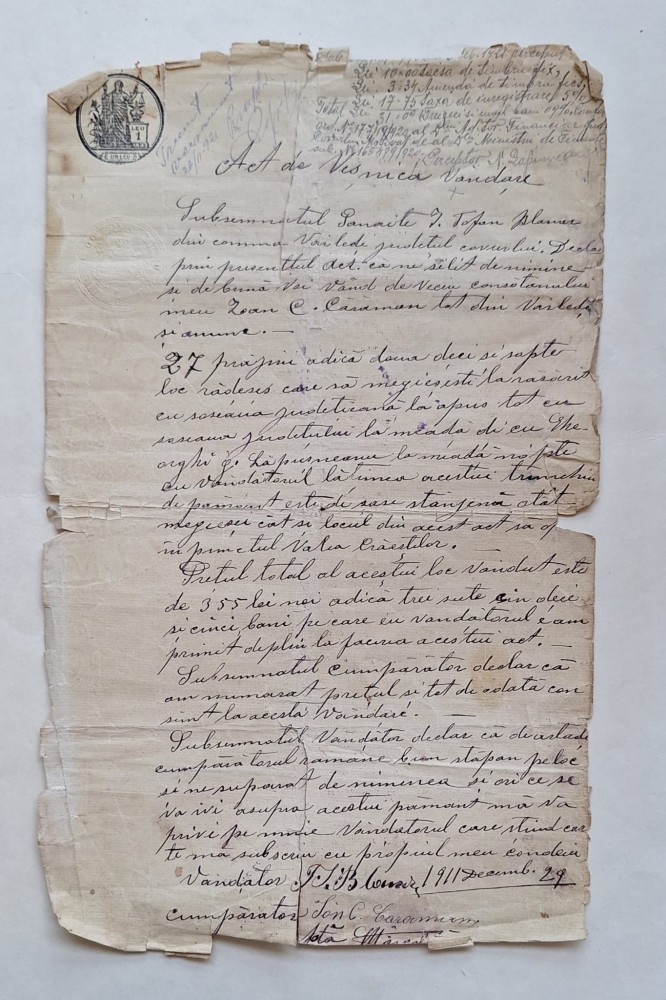 Act de veșnică vânzare teren – Vălcilei, județul Covurlui – 1911 – timbru fiscal