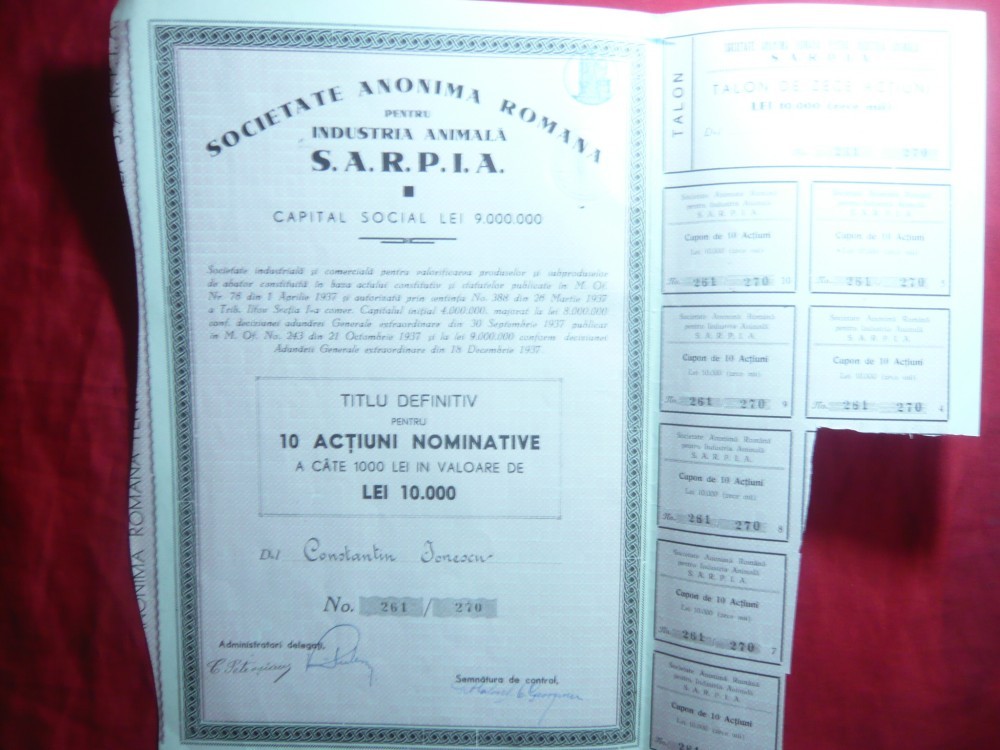 Actiune Societatea pt Ind. Animala SARPIA ,titlu 10 Actiuni a 1000 lei 1937