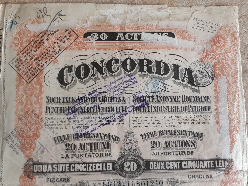 ACTIUNI CONCORDIA SOC. ANONIMA ROMANA PENTRU INDUSTRIA PETROLULUI -20 LEI - 1923