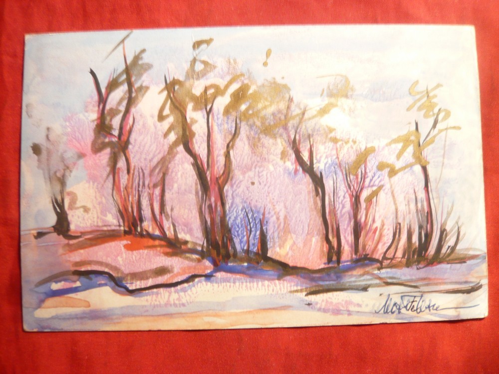 Acuarela -dim. carte postala - Padure iarna , semnat