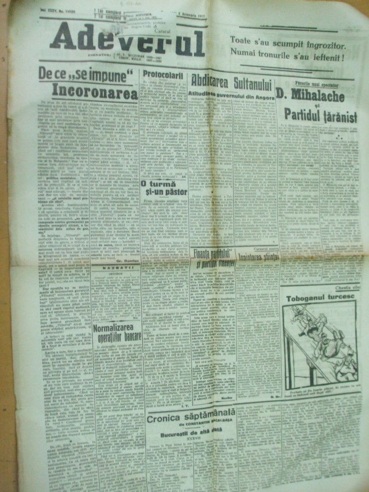 C. BACALBASA BUCURESTII DE ALTADATA BIRTUL LUI COSTACHE DELIMACHE UNDE SE STRANGEAU STUDENTII MACEDONENI : GHEJAN, A. BAGAV, C. CAIRETTI, GULIOTI, SIMOTA, NICULESCU, ZISU. C. COSTA – FORU I. MIHALACHE SI PARTIDUL TARANIST. ACADEMIA ROMANA COMUNICARE N. IORGA. BOTOSANI ARESTARE PRIMAR. SOLEMNITATI 100 ANI RESTAURAREA DOMNILOR PAMANTENI. GIURGIU CONTRABANDA PETROL. GIURGIU FEMEIE NASTE PRUNC CU 2 CAPETE. PALATUL JUSTITIEI INTRE PROPIRETARI SI CHIRIASI. CHISINAU AJUTORUL DE PRIMAR ESTE SANTAJIST SI HULIGAN. IMPACAREA DINTRE REGE SI AVERESCU. INTRE TARANISTI SI ARDELENI DECLARATIE AL. MARGHILOMAN. CARICATURA TOBOGANUL TURCESC. CHESTIUNEA REFUGIATILOR LINIILE FERATE VOR FI PUSE SUB PAZA DECLARATII I.G. DUCA. DISPOZITII PENTRU SERBARILE INCORONARII. REVOLUTIA DIN GRECIA CUM S-A PRODUS. ROMANIA SI EVENIMENTELE DIN BALCANI. TENSIUNEA DINTRE ANGLIA SI TURCIA. RUSIA DECLARATII CICERIN. REVOLUTIA DIN SERBIA.