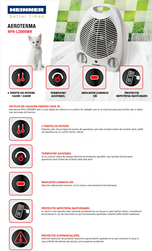 Aeroterma Heinner, 1000/2000 W, 2 trepte putere, termostat