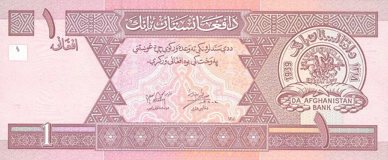 Splendida bancnota de 1 Afghani din Afganistan 2002 (P-64) în stare necirculatã (UNC).