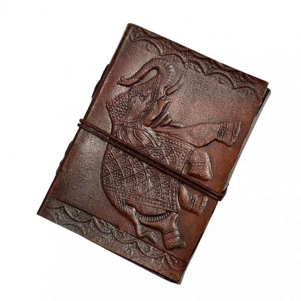 Agenda-Jurnal simbol ELEFANT, Coperta Piele Ecologica, 100 File, 13x10x2 cm Agenda-jurnal hand-made cu simbol ELEFANT, prevazuta cu snur si coperta din piele ecologica. Contine foi din hartie groasa craft, nedatate, ideale pentru notite sau ganduri personale. Realizata din materiale de calitate superioara, are dimensiuni compacte (13x10x2 cm) si un design atragator, perfect pentru uz personal sau cadou special.