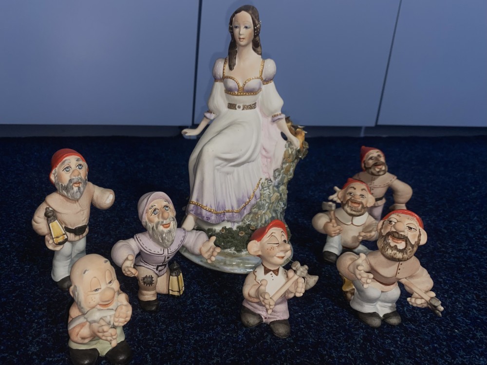 Set decorativ din porțelan fin pictat manual - "Albă-ca-Zăpada și cei 7 pitici" vintage / colecție