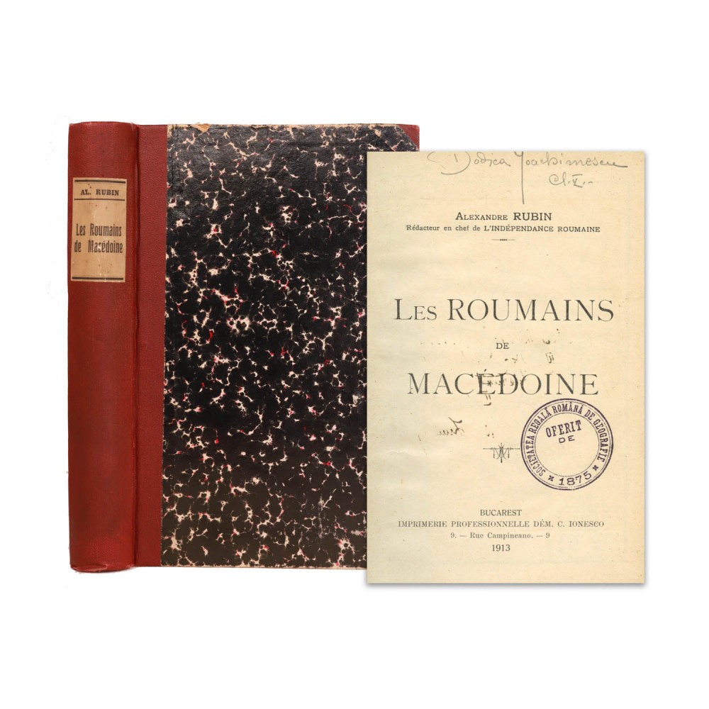 Alexandre Rubin, Les Roumains de macedoine, București, Imprimeria Dem. C. Ionescu, 1913, 319 p. Cu numeroase ilustrații și reproduceri fotografice în interiorul și în afara textului și cu o hartă a României tip planșă la început. Volumul a fost oferit ca premiu elevei Ioachimescu Teodoria în anul 1916. Legătură de epocă cu cotor și colțuri din pergamoid.