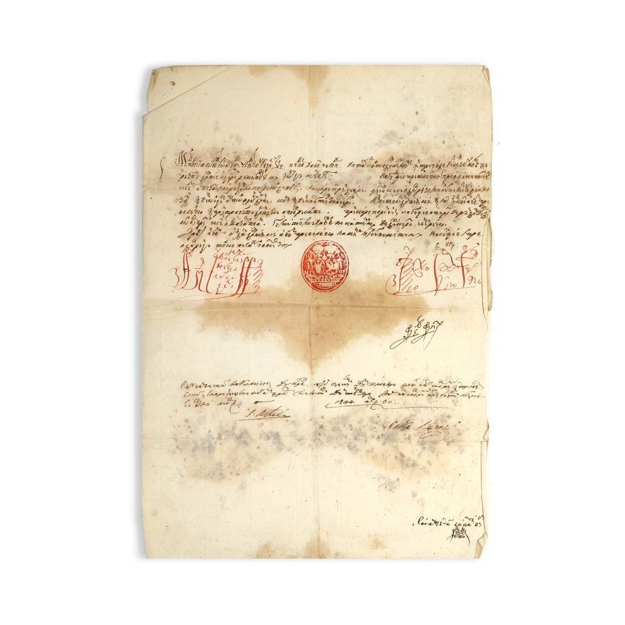 Alexandru Nicolae Suțu, Hrisov de întărire a privilegiilor pentru neguțătorul Ioniță Măinescu din Târgoviște, 1819. Act original, întărit prin monogramă domnească și pecete în chinovar (varianta cu simbolurile heraldice ale dublei domnii, din 1818). „Milostiiu Bojiiu Io Alexandru Nicolau Suțu Vvd i gospodar davat gospodva mi, dat-am cartea Domnii mele întru cea den nou noă hărăzită domnie a Țării Românești, lui Ioniță Măine(scu), ca să-i fie priveleghiu spre a fi cunoscut că este așăzat la orânduiala boerilor de neam, fiindcă să adeverează mai sus numitul a fi așăzat și din cărțile altor frați domni, cum și din catastișele (sic) vistieríi, am binevoit domniia mea și i-am înnoit acest priveleghiu și prin această a noastră domnească carte prin care poruncim ca să fie apărat de rânduiala dijmelor vistieríi, ce sânt așăzate pe an, să scutească drepte bucatele sale de dijmărit i vinăriciu. Drept aceea am dat Domniia mea acest priveleghiu la mâna mai sus numitului ca să-i fie spre adeverință, tolko pisah gospodvami. 819. Noi Alexandru Nicolau Suțu VVd / Milostiiu Bojiiu Gospodariu”. Numele beneficiarului completat (în prima parte a textului) de o altă mână. Mai jos, dreapta, Vel Vistier și în colțul inferior drept, al hrisovului, mențiunea că privilegiul domnesc s-a trecut (așăzat) în catastihul vistieriei (Voinea stolnicul). Actul prezintă și o notă din anul 1844: „S-au cercetat la comisia din Prahova pentru Bănică din Ploești, fiiul celui coprins într-acest sinet, care zise că mai are un frate, pă Ioniță din Târgoviște, iar cel coprins aici, Ioniță Măinescu să află mort. 1844 aprilie 30.” (semnat I. Mateescu și I. Pavel)