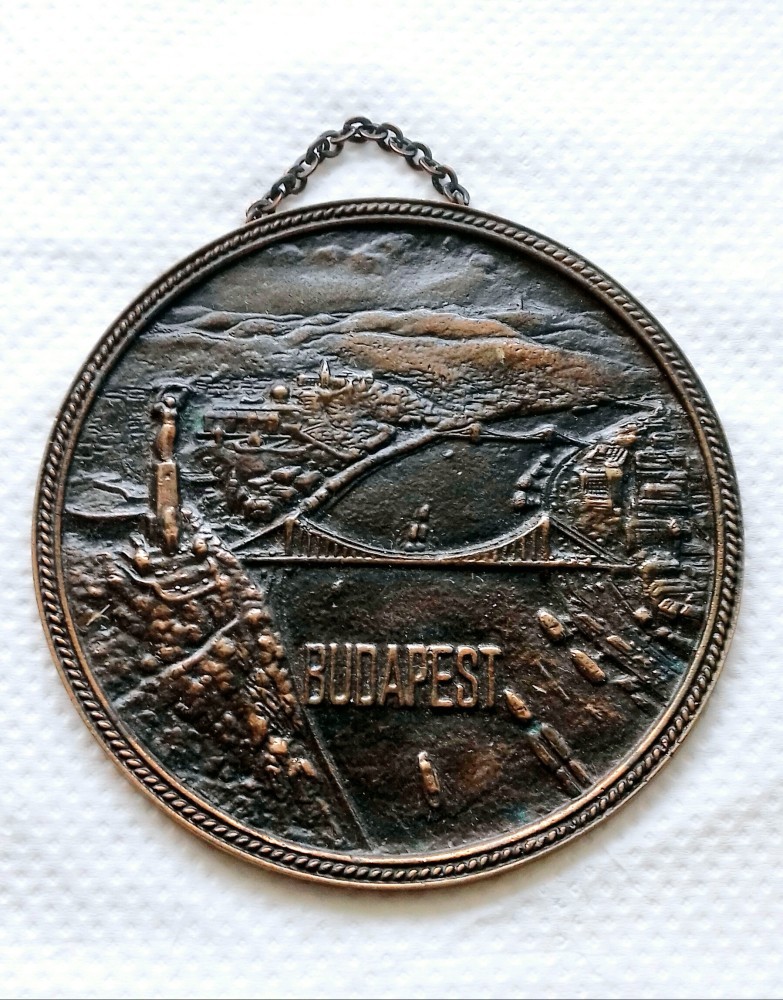Basorelief din bronz, cu diametrul de 10,7 cm, inspirat din Budapesta anilor '70-'80. Finisajul mat si patina usoara ii confera un aspect vintage, iar designul simplu si stilizat reflecta principalele simboluri ale orasului din acea perioada.