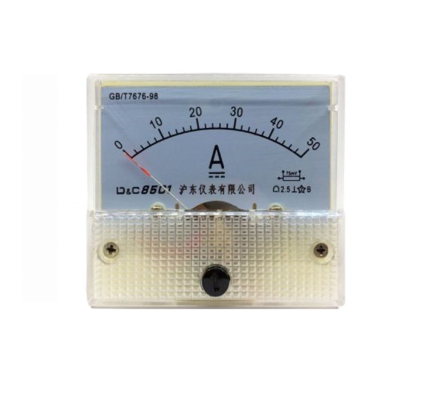 Ampermetrul analogic de panou pentru 50A curent continuu este destinat masurarii curentului in circuite DC, avand precizie de ±1.5%. Functionarea sa necesita utilizarea unui sunt extern (neinclus) pentru masurarea corecta a valorilor de curent. Carcasa compacta, cu dimensiuni de 63 x 55 x 60 mm, permite montarea pe panou prin prindere cu suruburi, fiind adecvat pentru aplicatii industriale sau hobby.