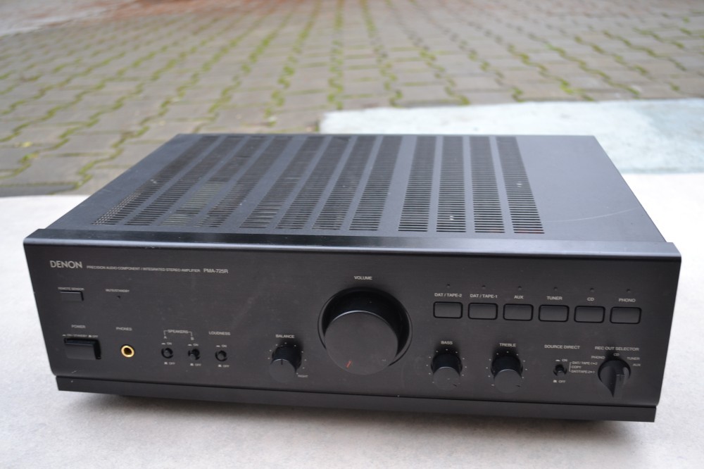 Amplificator Denon 725 R: 5 intrari, 4 iesiri, impedanta 4-16 ohmi, 210 W consum din retea, 2 trafuri, reglaje bass, treble, balance, Loudness, senzor pentru telecomanda, intrare casti, Source Direct, volum centru, culoare neagra, poze reale.