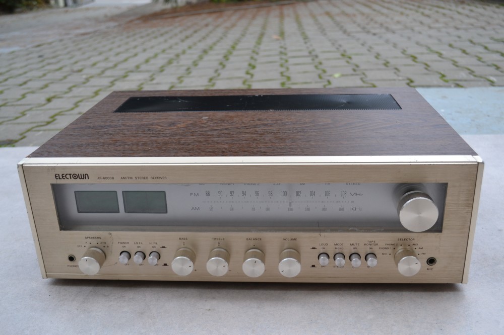 Amplificator Electown AR 6000 B: 4 intrari, 4 iesiri, 4-16 ohmi,vintage, carcasa lemn, made in Korea, radio cu scala iluminata, low/high filter, reglaje bass, inalte, balance, loudness, intrare microfon, vu metre tuning semnal, iesire casti, poze reale.