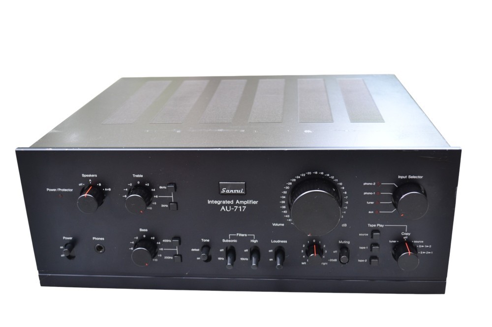 Amplificator Sansui AU 717: made in japan, 7 intrari, 4 iesiri, 4-16 ohmi, 2 trafuri, 4 cndensatri filtraj, 2 radiatoare, 425W consum, negru, reglaje bass, inalte, balance, reglaj bass/inalte pe frecventa, muting, loudness, subsonic, high filter, poze reale.