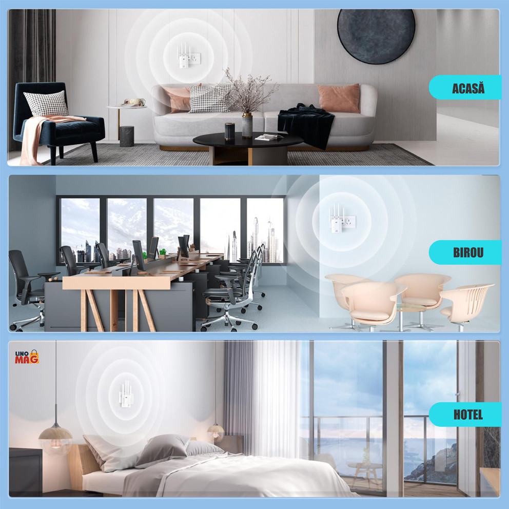 Amplificatorul de semnal WiFi Linomag, funcționează cu toate standardele de routere sau gateway-urilor 802.11 b/g/n, 802.11ac.