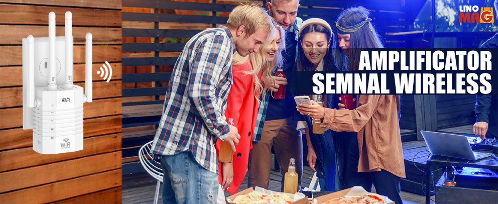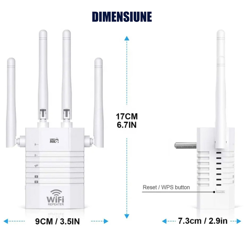 Amplificator Semnal Wireless Linomag®, Range Extender Retea WiFi, 4 Antene, Retea 2.4 & 5GHz Dual Band, Trasnfer pana la 1200Mbps, 2 x Port LAN, Acope