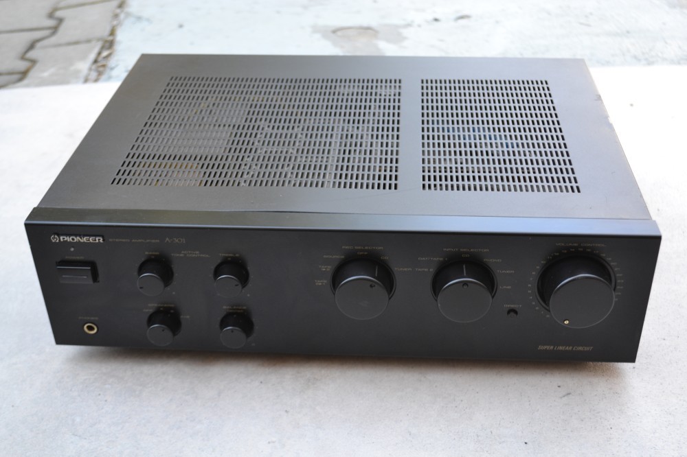 Amplificator Pioneer A-301: 6 intrari, 4 iesiri, source Direct,super linear, reglaje bass, treble, balance, impedanta 4-16 ohmi, made in Japan, 410W consum, iesire casti, culoare neagra. Poze reale.